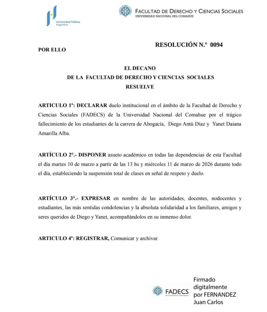La Facultad de Derecho y Ciencias Sociales de la Unco dispuso asueto académico en todas sus dependencias el martes 10 de marzo a partir de las 13 horas y miércoles 11 de marzo de 2026 durante todo el día, estableciendo la suspensión total de clases en señal de respeto y duelo.