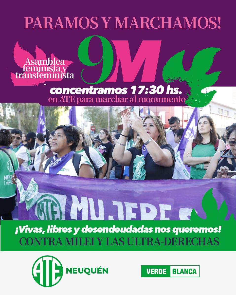 La Asociación Trabajadores del Estado (ATE) Neuquén confirmó un paro de 24 horas para el lunes 9 de marzo y convocó a una movilización en el marco de las actividades por el Día Internacional de la Mujer Trabajadora.