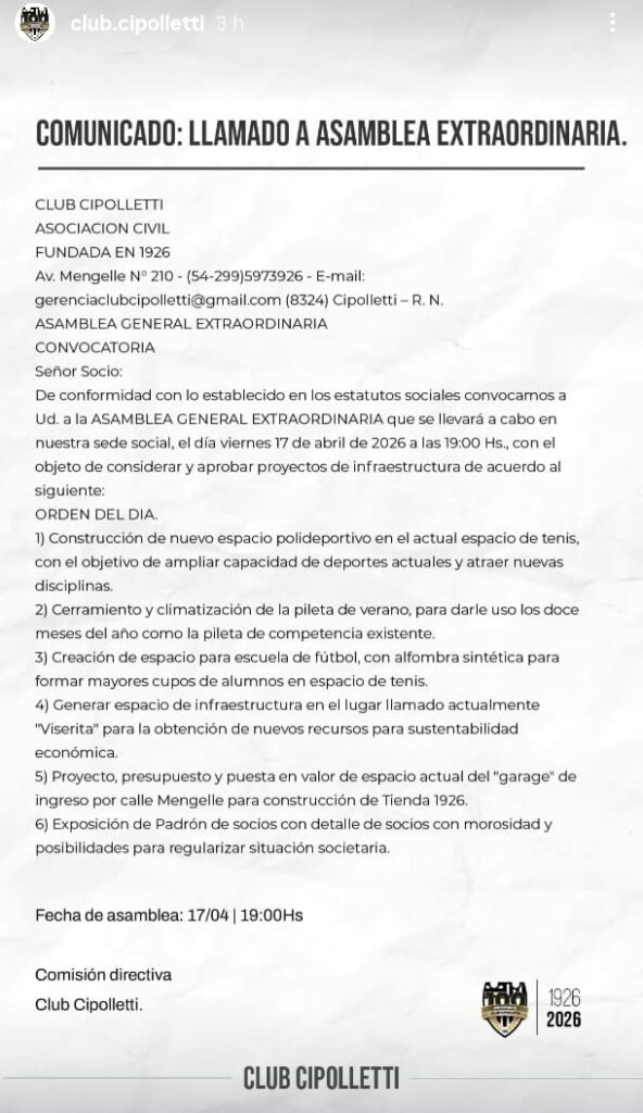 El Club Cipolletti lanzó un llamado a Asamblea General Extraordinaria que se realizará el próximo viernes 17 de abril a las 19 en su sede social, con el objetivo de analizar y aprobar una serie de proyectos vinculados al crecimiento institucional y deportivo.