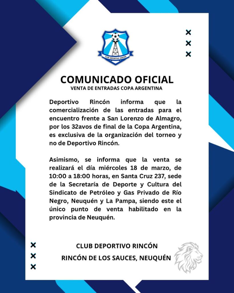 El Deportivo Rincón brindó precisiones sobre la modalidad de venta de entradas para el partido ante San Lorenzo de Almagro, correspondiente a los 32avos de final de la Copa Argentina.