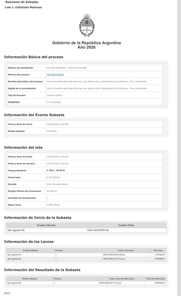 El proceso se realizó mediante una subasta electrónica, a través del sistema oficial SUBAST.AR. El predio tiene una superficie total de 3.558,63 metros cuadrados y el precio base es de 2.791.808,87 dólares. La firma oferente fue San Agustin S.A y fue la única en presentarse.