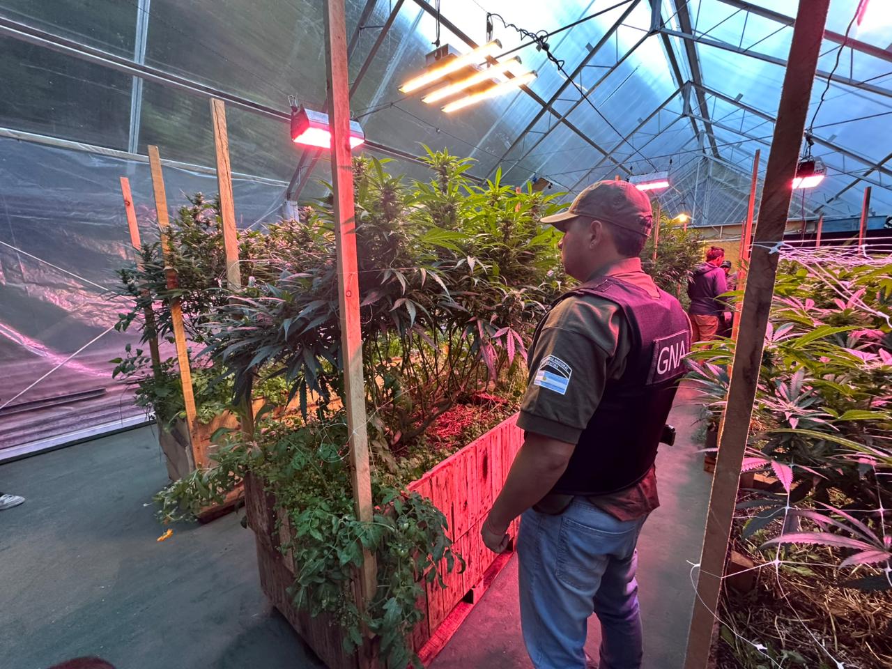 Durante el registro del primer domicilio, los gendarmes hallaron la construcción de un invernadero de marihuana a gran escala en donde se realizaba el cultivo bajo distintos procesos de iluminación, de resguardo, de crecimiento, de ventilación y secado. En ese lugar se secuestraron 28 kilos de cannabis.