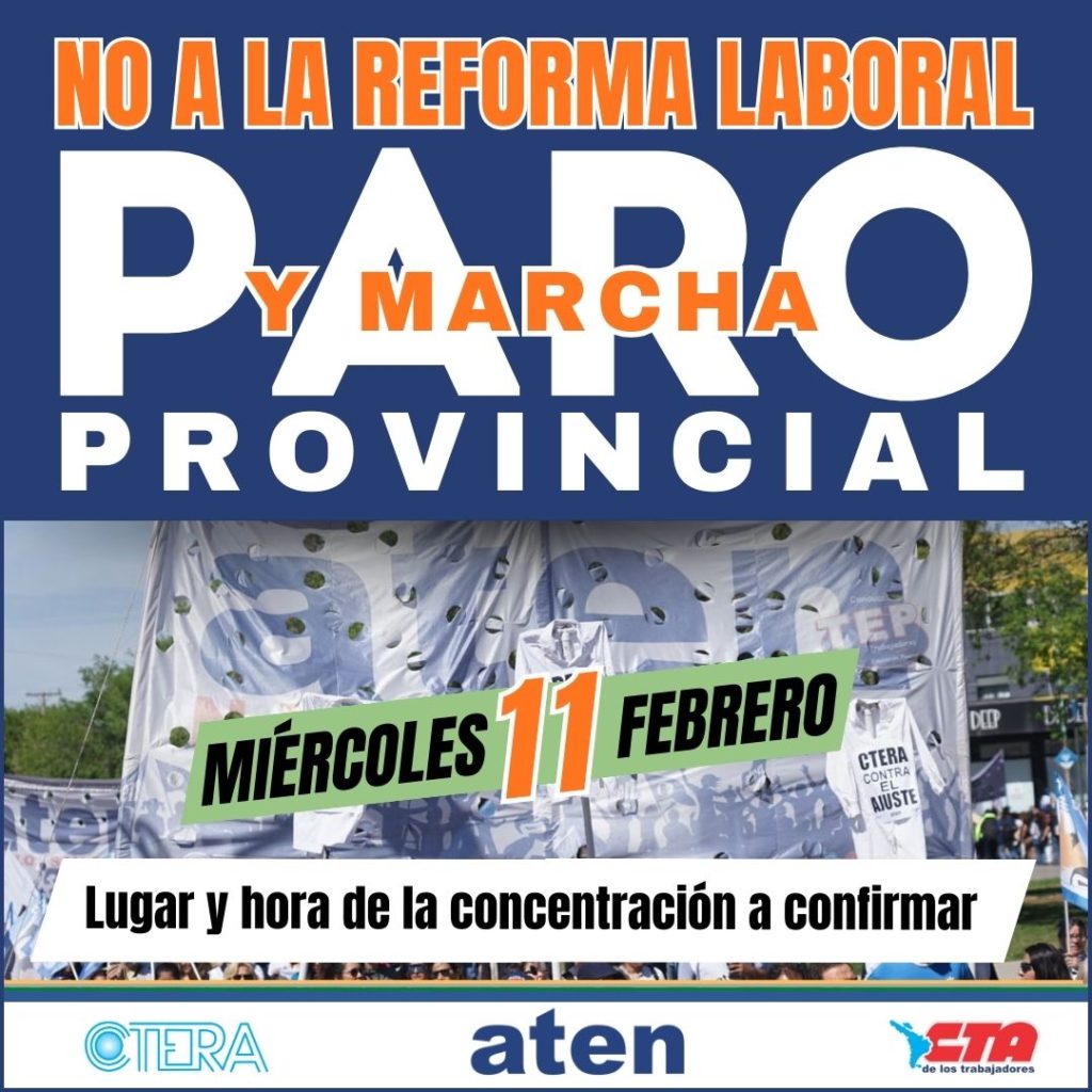 El gremio docente neuquino ATEN anunció un paro provincial y una movilización para el próximo miércoles 11 de febrero en rechazo al proyecto de reforma laboral que se debatirá en el Congreso de la Nación. A la medida también se sumaron los docentes universitarios nucleados en la CONADU Histórica, en el marco de una jornada nacional de protesta.