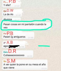 «Alumna. Pasan cosas en mi pantalón cuando la veo», le responden. Otro pide que pasen su cuenta de Instragram y uno remata: «A ver quién la pone en su mesa el año que viene». También opinan sobre sus cuerpos y hacen bromas respecto de quién será su docente y tendrá la oportunidad de evaluarla o incluso de tener relaciones sexuales con ellas. «Nos cae mal, no se acuesten con el enemigo», comenta uno sobre una estudiante. «Llenale la jeta de leche y después decidí que tal te cae…mirá las cosas que se pone a pensar este muchacho», le contesta otro.