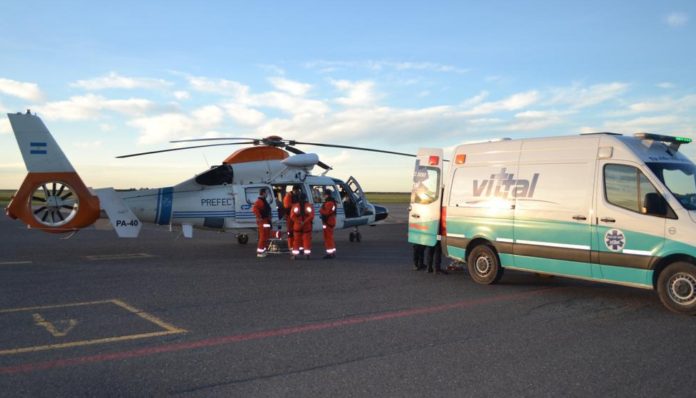 El primer operativo se dirigió a Trelew, por la cercanía con la embarcación, y permitió trasladar a un trabajador con un cuadro cardíaco agudo.