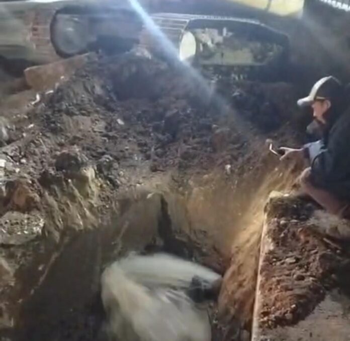 Neuquén.- Personal del EPAS trabaja en la reparación de una cañería de distribución de agua potable en la intersección de Avenida Mosconi y Leguizamón de Neuquén capital.