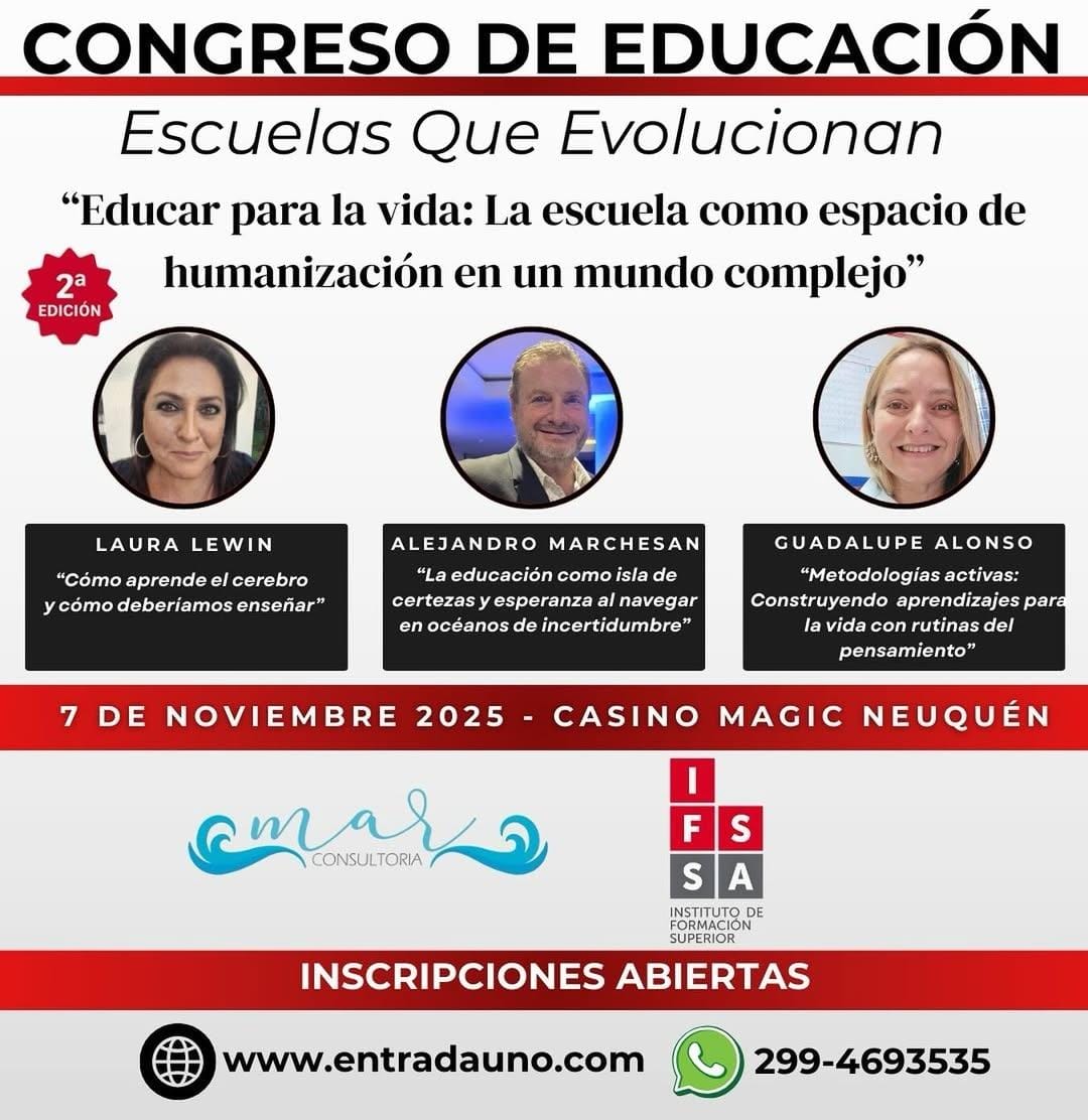 Neuquén.- En una jornada que promete ser dinámica y llena de nuevos contenidos, este viernes 7 de noviembre se llevará a cabo el congreso de educación Escuelas que Evolucionan “Educar para la vida: la escuela como espacio de Humanización en un mundo complejo”.