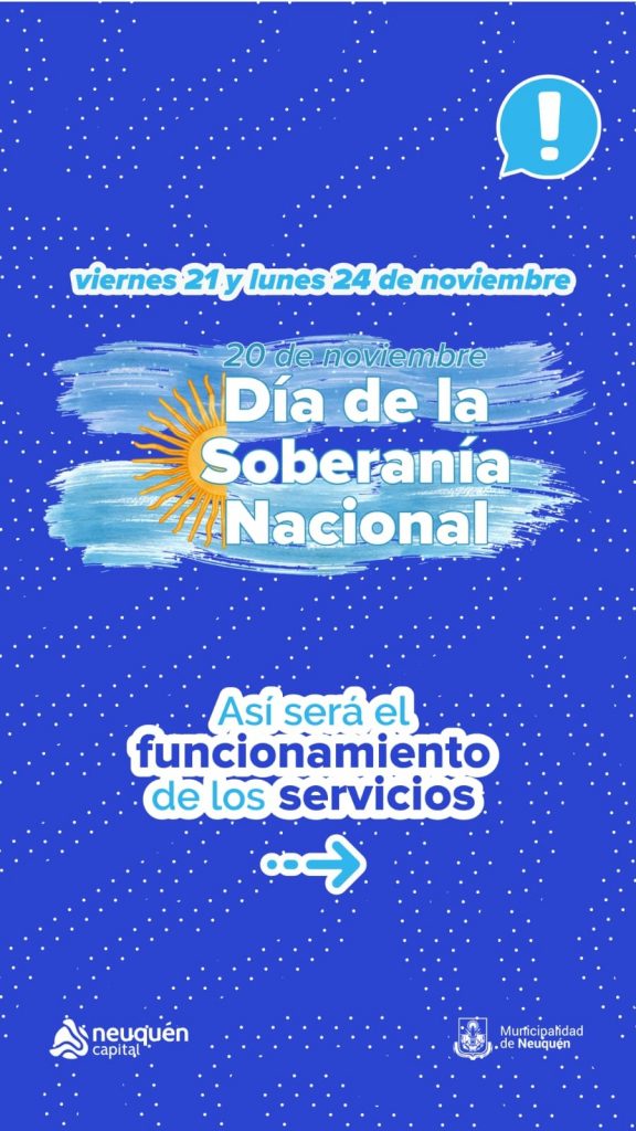 Con motivo del feriado extra largo del viernes al lunes por el Día de la Soberanía Nacional permanecerán cerradas las oficinas de la Municipalidad de Neuquén, pero estarán activos los servicios de guardia y de emergencia.