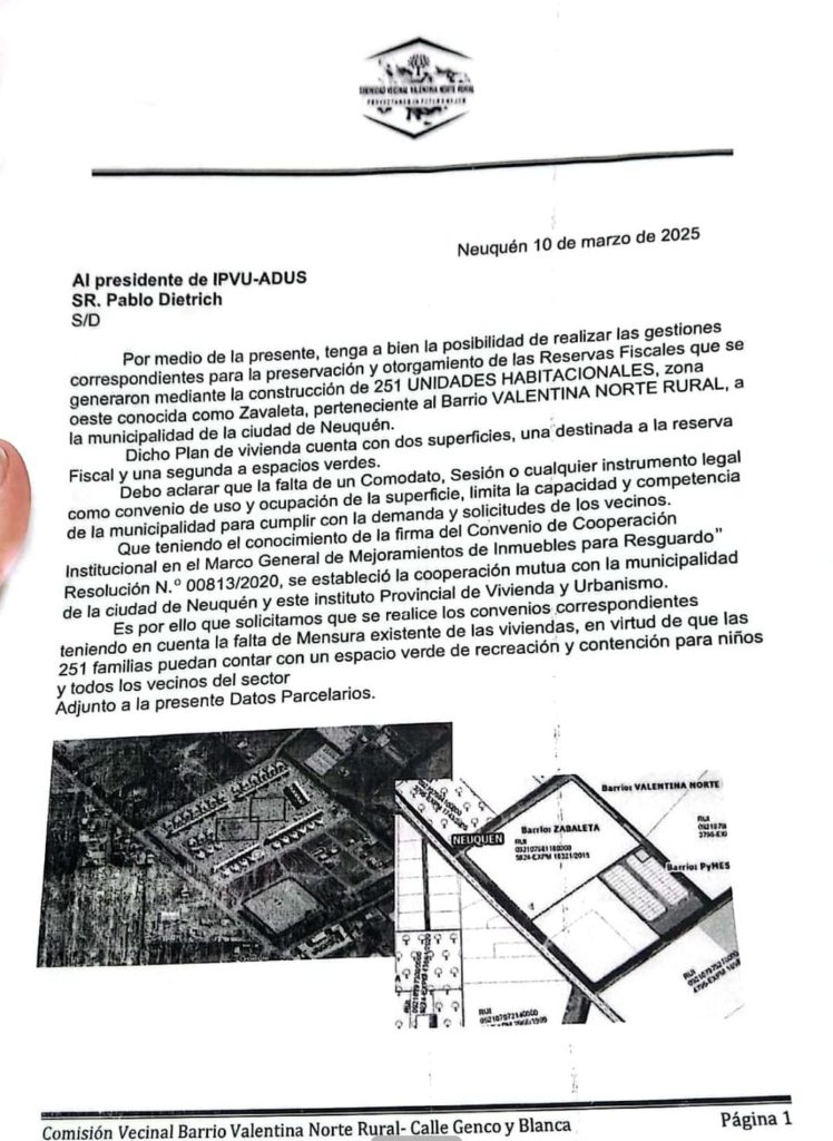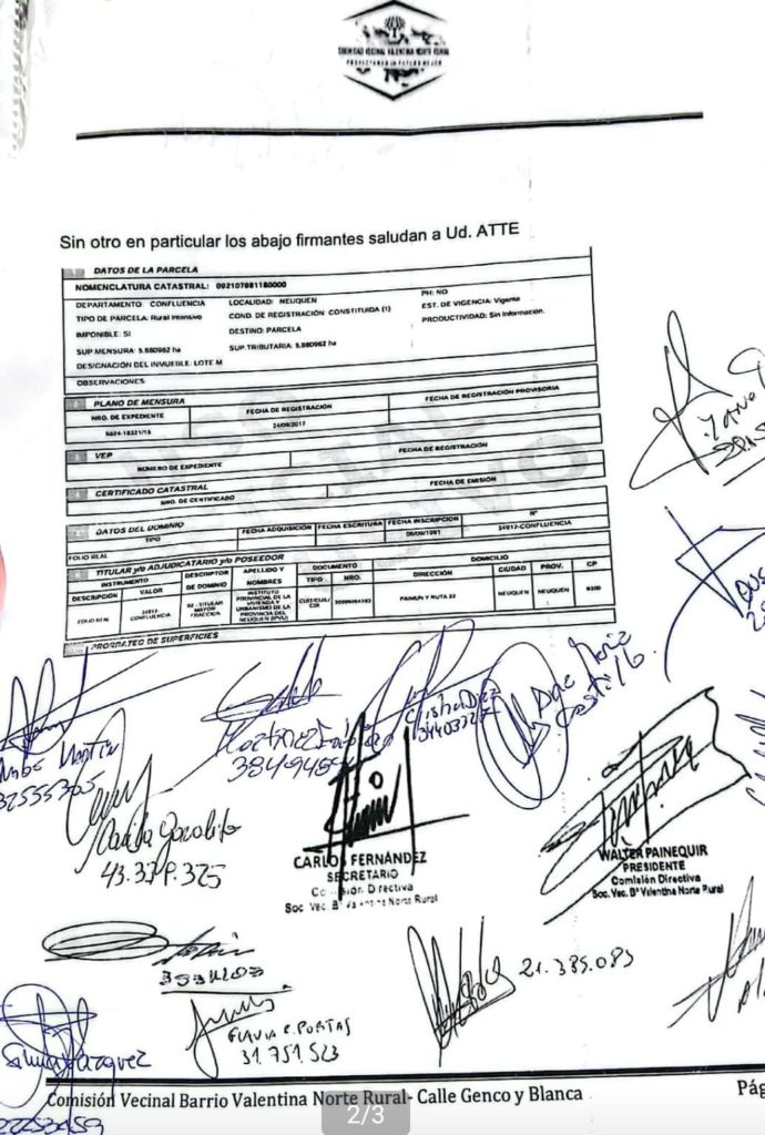 «Si bien están los planos en donde se indica espacio verde y tierra fiscalizada, no cuenta con la mensura impidiendo el traspaso correspondiente a dominio municipal. Por la situación hubo una reunión con el presidente de la comisión, Walter Painequir, y el ministerio de Gobierno que asumió el compromiso de agilizar la situación. Dos meses más tarde se dio una reunión con una autoridad en representación de IPVU, el señor Martín Villain que no brindó ninguna información relevante hasta el día de hoy», relató.