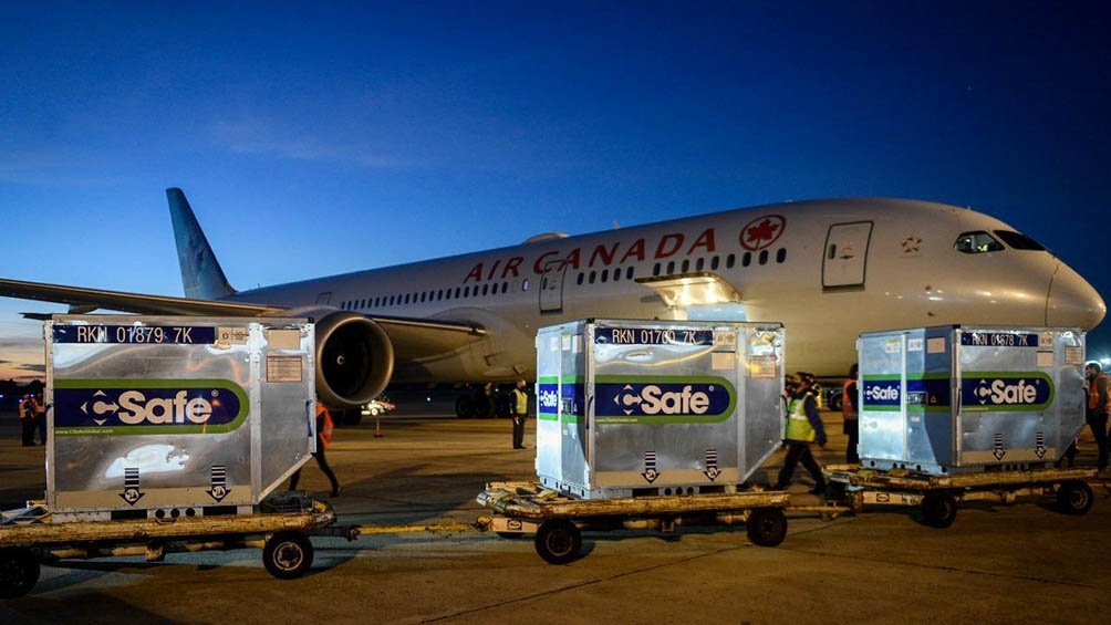 El vuelo AC7326 de Air Canada procedente de Toronto aterrizó en el aeropuerto internacional de Ezeiza a las 6:45 con una carga en sus bodegas de 2.148.600 dosis que fue recibida por el jefe de Gabinete Santiago Cafiero y la ministra de Salud Carla Vizzotti.