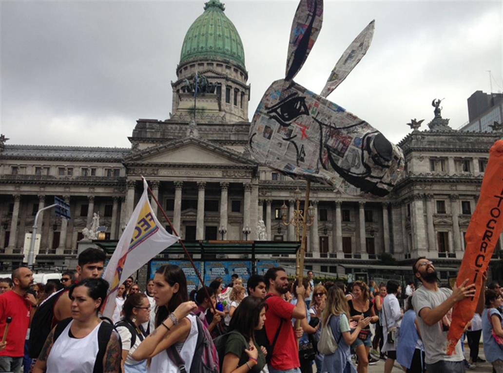 La protesta tiene lugar en el marco del reclamo de los maestros de salarios más altos para equilibrar la pérdida adquisitiva que sufrieron el año pasado ante una inflación que alcanzó un ritmo del 40,9 por ciento anual y enfrentar el alza de precios actual, en medio de un enfrentamiento político de los sindicatos con el gobierno de Mauricio Macri.