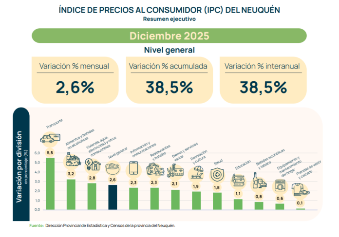 El Índice de Precios al Consumidor (IPC) registró en diciembre una suba del 2,6% en Neuquén, según informó este martes la Dirección Provincial de Estadísticas y Censos. Con este dato, la inflación acumulada durante todo el 2025 alcanzó el 38,5%, por encima del registro nacional, que cerró el año en 31,5%.