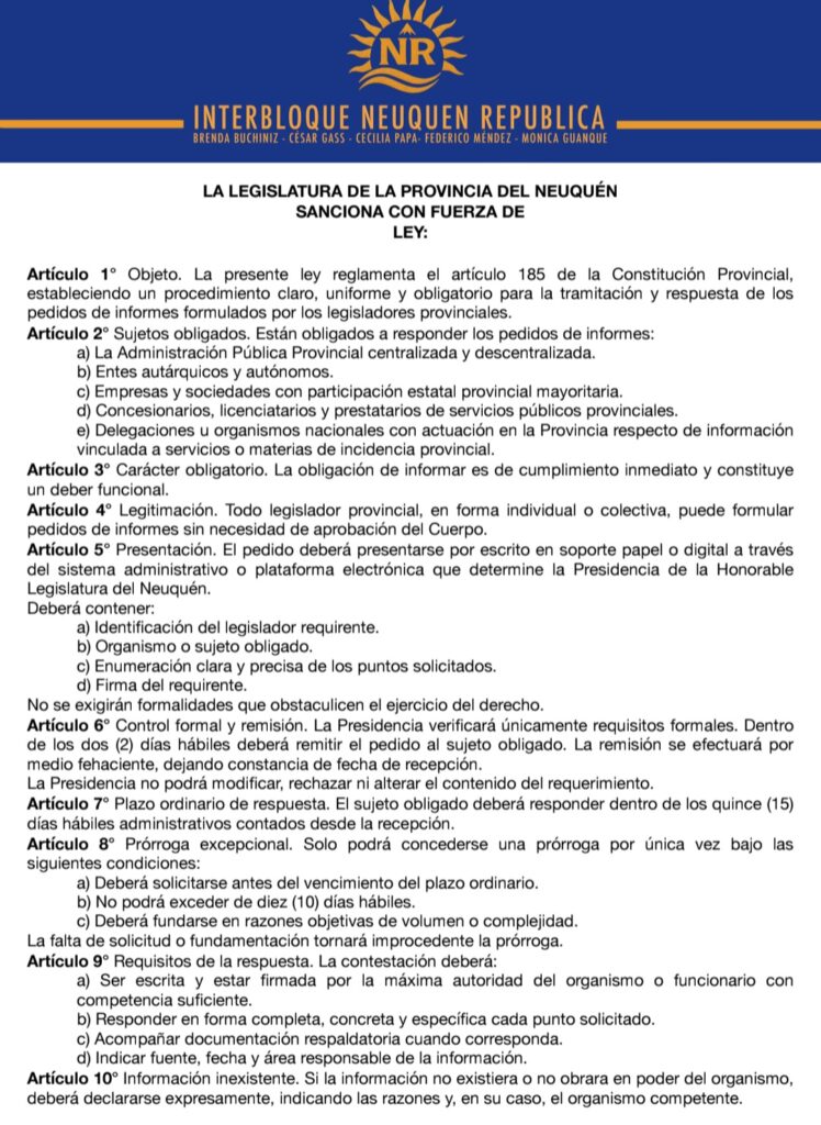 Neuquén.- El bloque legislativo Neuquén República presentó un proyecto de ley en la Legislatura con el objetivo de mejorar la transparencia y la eficiencia en el proceso de pedidos de informes dentro de la casa de las leyes.