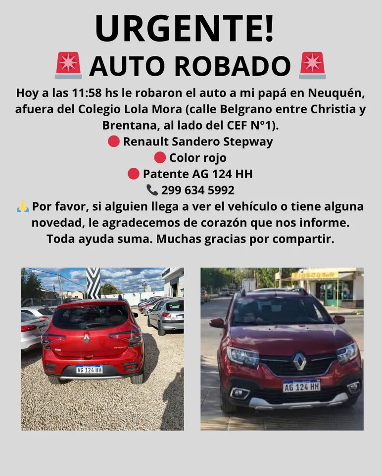 Desde entonces, la familia inició una campaña en redes sociales para intentar recuperar el vehículo y solicita la colaboración de la comunidad. “Toda ayuda suma”, expresaron.