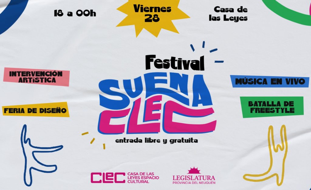 Neuquén.- La Casa de las Leyes Espacio Cultural realizará el festival SUENA CLEC, un encuentro que celebra la música, las artes visuales y las expresiones contemporáneas de Neuquén. El evento será el 28 de noviembre, desde las 18 horas y hasta la medianoche con entrada libre y gratuita, en la dirección Avenida Olascoaga 560 de Neuquén capital.