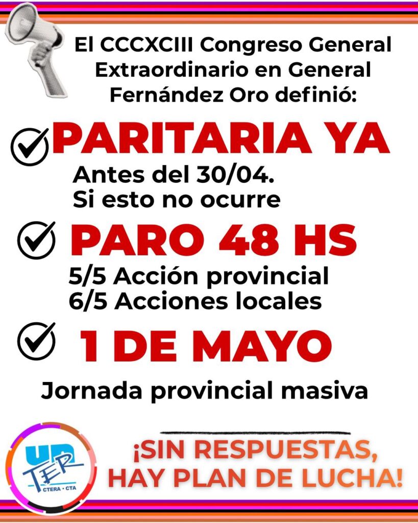 Uno de los reclamos fundamentales es la convocatoria a una reunión paritaria «antes del 30 de abril». A través de un comunicado, el sindicato informó que «si esto no ocurre habrá paro por 48 horas».
